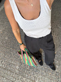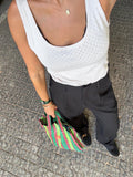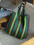 Our market bag is hand-made from 100% recycled nylon. Colorful stripes that would definitely upgrade any outfit. 37 cm wide, 40 cm high. Strap is 66 cm long.