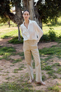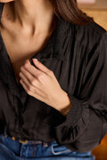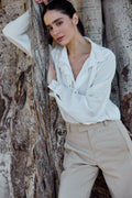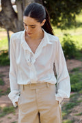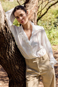 A luxe semi-silk blouse that brings effortless sophistication to your wardrobe. Romantic lace trim frames the collar and sleeves, creating an elegant focal point. Available in crisp white and classic black, this piece is the definition of chic—styled for those who appreciate understated luxury and timeless appeal. 100% polly.