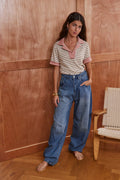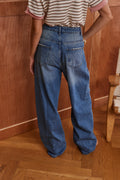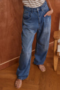 So cool and classic, these timeless jeans are the perfect denim staple. High-rise, with a slouchy wide silhouette. Button fly closure, five-pocket design, wide curved leg silhouette with pleated detailing, soft rigid denim. Keep it Effortlessly chic. waist-line is very high we recommend to size up. Model wears size S. 100% Cotton.