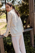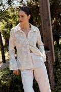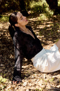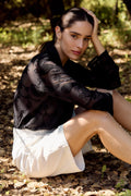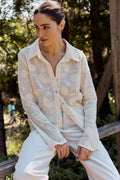 This top transcends everyday style with its thoughtfully crafted design. Made from 100% cotton, it features a delicate net adorned with intricate paisley embroidery that catches the light beautifully. The fitted silhouette is balanced by graceful bell sleeves, creating an effortlessly elegant look. Available in two rich colorways. The model pictured wears size S.