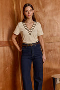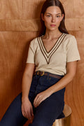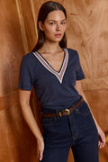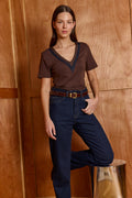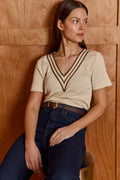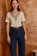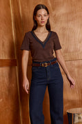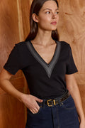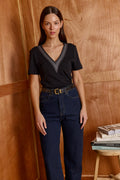 Indulge in the ultimate comfort and style with The Dreamy Tee. Its deep v-neck and classic design exudes sophistication, while the v-neck ribbon adds a touch of elegance. This luxurious tee will surely steal the spotlight and elevate your vibe to perfection. 100% cotton.